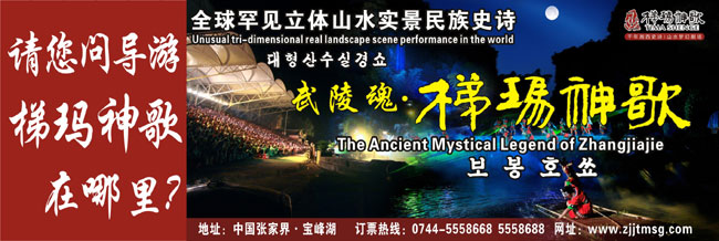 The Ancient Mystical Legend of Zhangjiajie 《武陵魂•梯瑪神歌》是一場(chǎng)記述土家族起源、演變、戰(zhàn)爭(zhēng)、生產(chǎn)生活等內(nèi)容的大型立體山水實(shí)景演出,揉合了音樂(lè)、舞蹈、文學(xué)等多種藝術(shù)形式,如幻如夢(mèng)的舞美燈光,搖曳生姿的原生態(tài)歌舞……濃縮了土家族數(shù)千年的發(fā)展歷史,400多名演員以自然淳樸的表演充分的展示了土家的民族文化特征,給游客帶來(lái)了耳目一新的感受。一場(chǎng)視聽(tīng)的饕餮盛宴,一曲驚天地、泣鬼神的曠世古歌,給人山水文化光影視聽(tīng)的享受!境銎罚簭埣医缣莠斏窀栉幕瘋鞑ビ邢薰尽