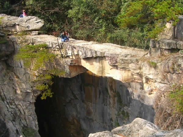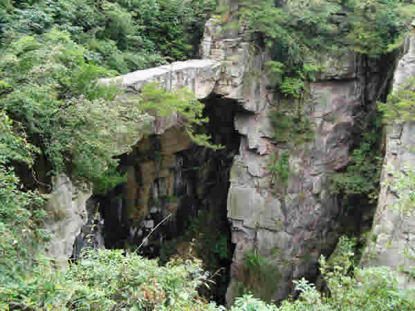 仙人橋,長(zhǎng)26米,寬1.6米,厚1米,高67米,飛架在兩處懸崖絕壁之間,鬼斧神工,驚險(xiǎn)而奇特。