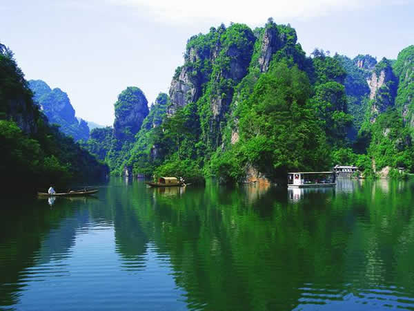 寶峰湖瀑布 湖中有兩座疊翠小島,近岸奇峰屹立,峰回水轉(zhuǎn)。泛舟漫游,只見(jiàn)一湖綠水半湖倒影,充滿詩(shī)情畫(huà)意!霸铺萑f(wàn)丈上天臺(tái),高峽平湖一鑒開(kāi),王母瑤池金扶,浣沙仙女下凡來(lái)”游寶峰湖,你就會(huì)欣賞到這樣的詩(shī)情畫(huà)意。群峰擁抱的寶峰湖,長(zhǎng)約2.,5公里,湖猶如一面寶鏡,四面青山,一泓碧水,蕩槳溫游,格外愜意。坐在船上,環(huán)顧四周,千山聳翠,俯視水中,倒影慢移,碧水照相館得群峰綠,人面桃花水映紅。真是靜極了,美極了!韓劇《九天洞》拍攝的湖水就是寶峰湖。