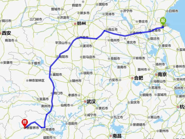 左右,沿途經過連云港——徐州——商丘——許昌——平頂山——南陽——襄陽——荊門——荊州——常德(也可以走國道經澧縣、石門縣)——慈利——張家界。